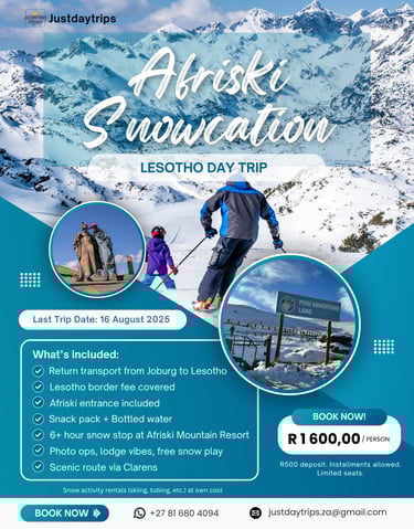 Join us for an unforgettable Afriski Snowcation in Lesotho! Experience breathtaking snow-covered landscapes, thrilling activities, and all-inclusive packages that cover snacks, border fees, and entry. Make memories that last a lifetime on this exciting day trip!