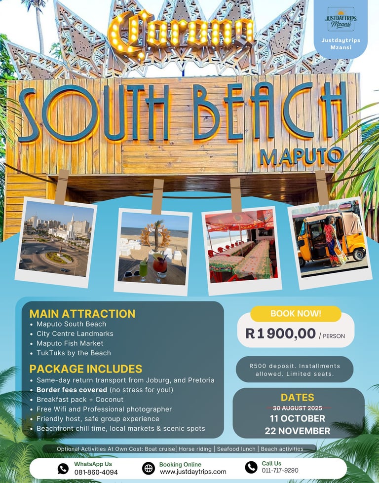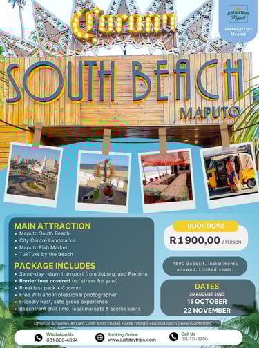 Discover the beauty and energy of Mozambique with Justdaytrips Mzansi on an exciting journey to Maputo South Beach. This unique day experience combines city highlights with seaside relaxation, giving you the best of both worlds. Explore Maputo’s famous landmarks and vibrant fish market, enjoy tuk-tuk rides by the beach, and soak up the lively coastal atmosphere.